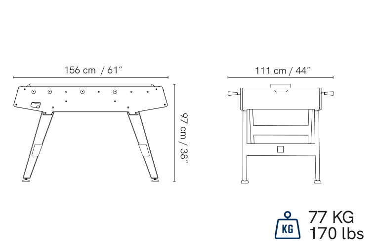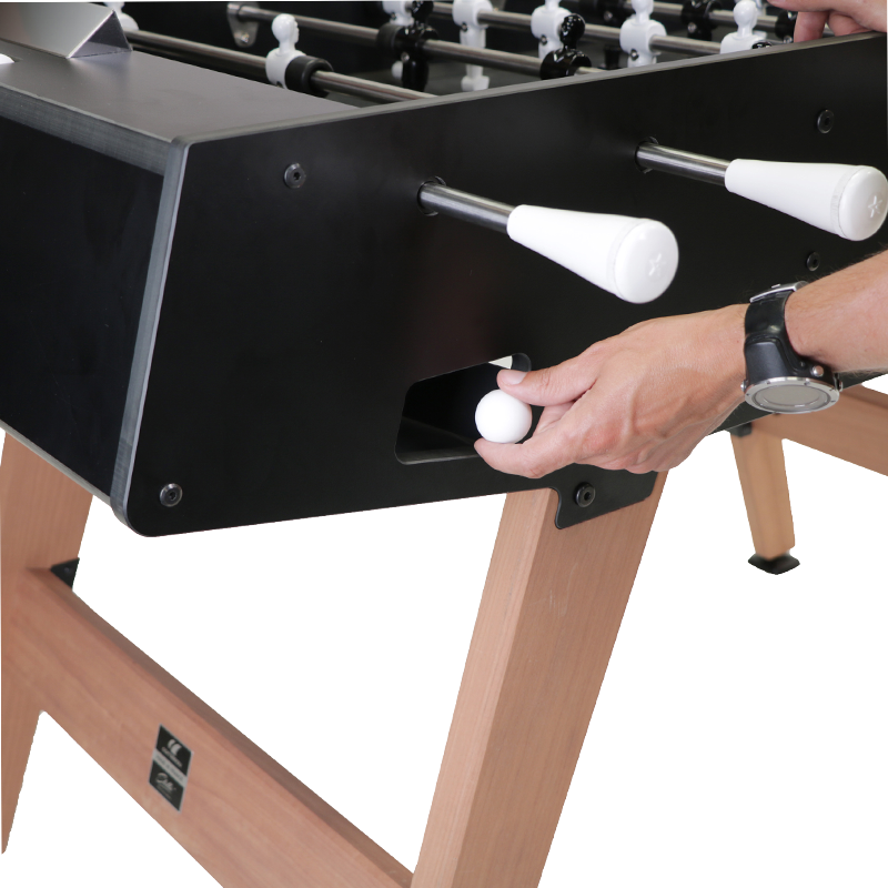 Its pure, refined structure sets it apart from traditional table football. The Gerflex surface ensures excellent playing quality, and it has its own special features, such as oblique side strips for jumping balls and stainless steel goals that produce a distinctive sound when a goal is scored.