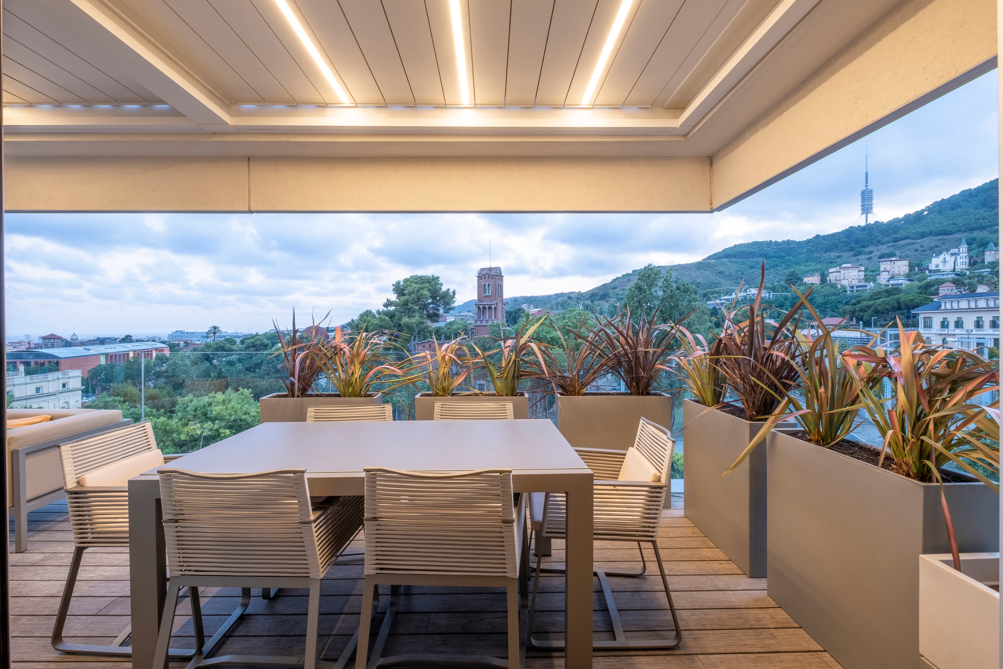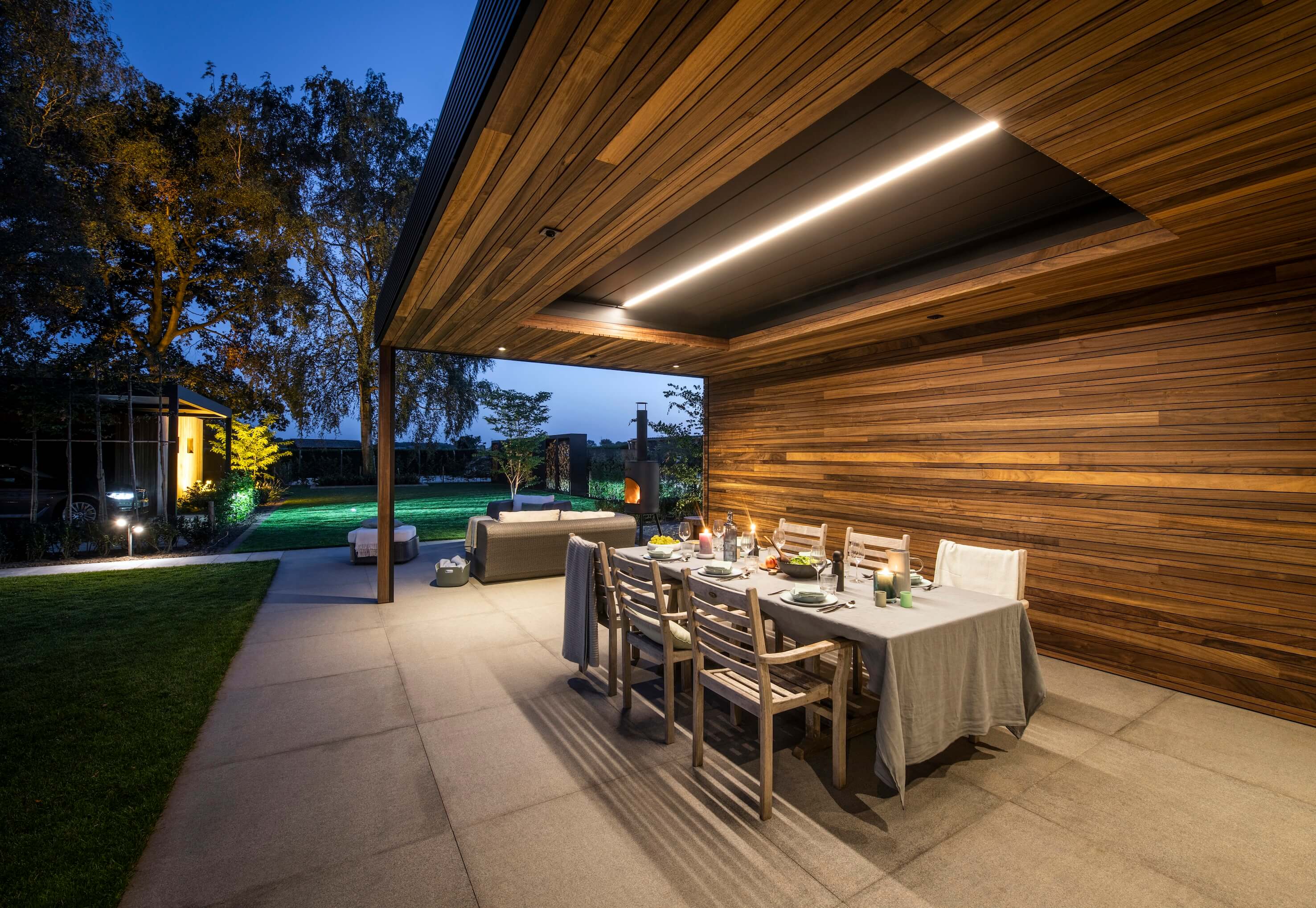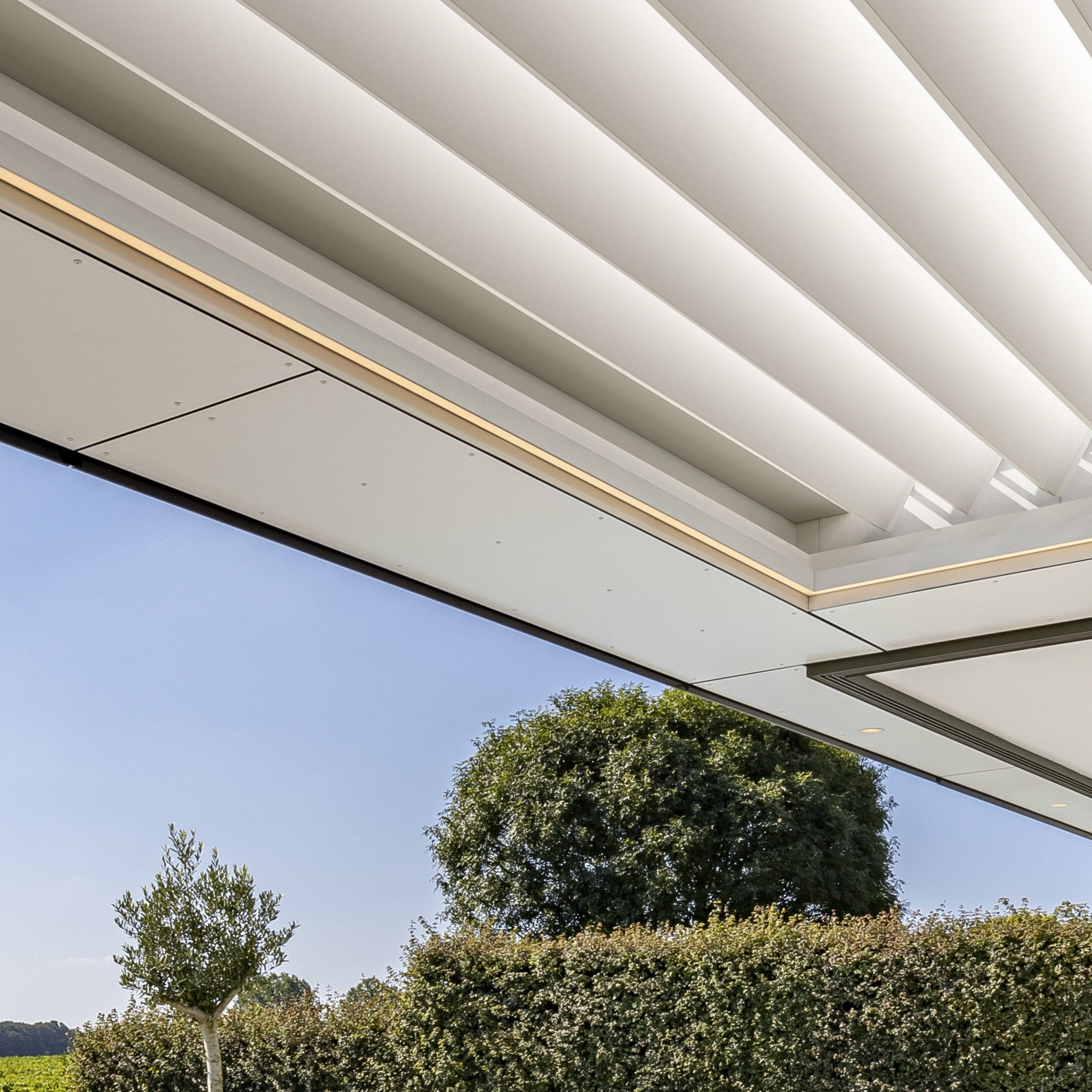 The Renson Aero can be equipped with integrated LED lighting, discreetly built into the structure to create a warm, inviting atmosphere for evening use