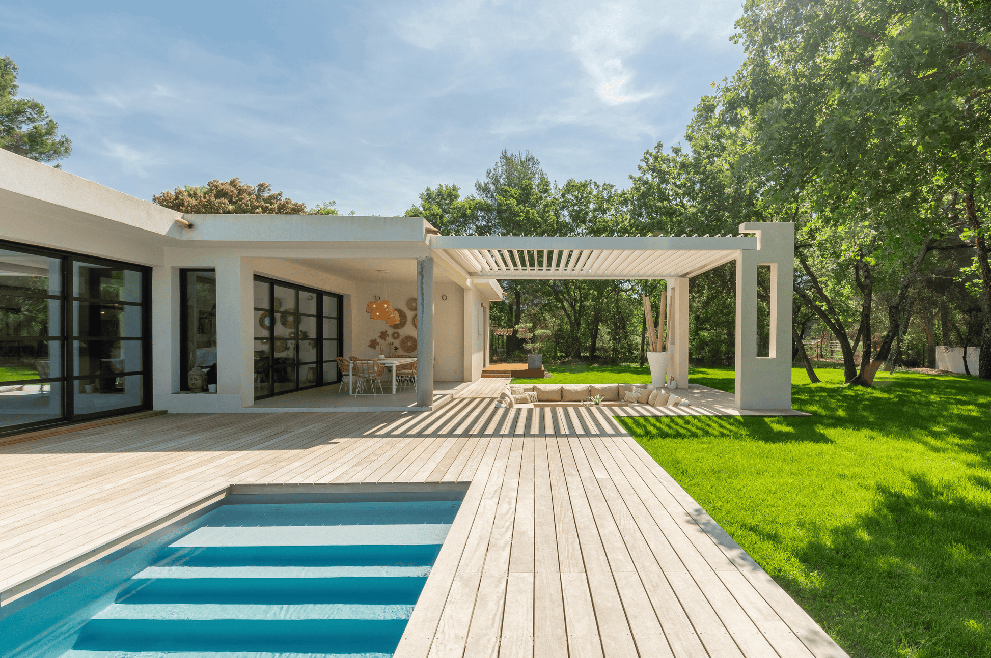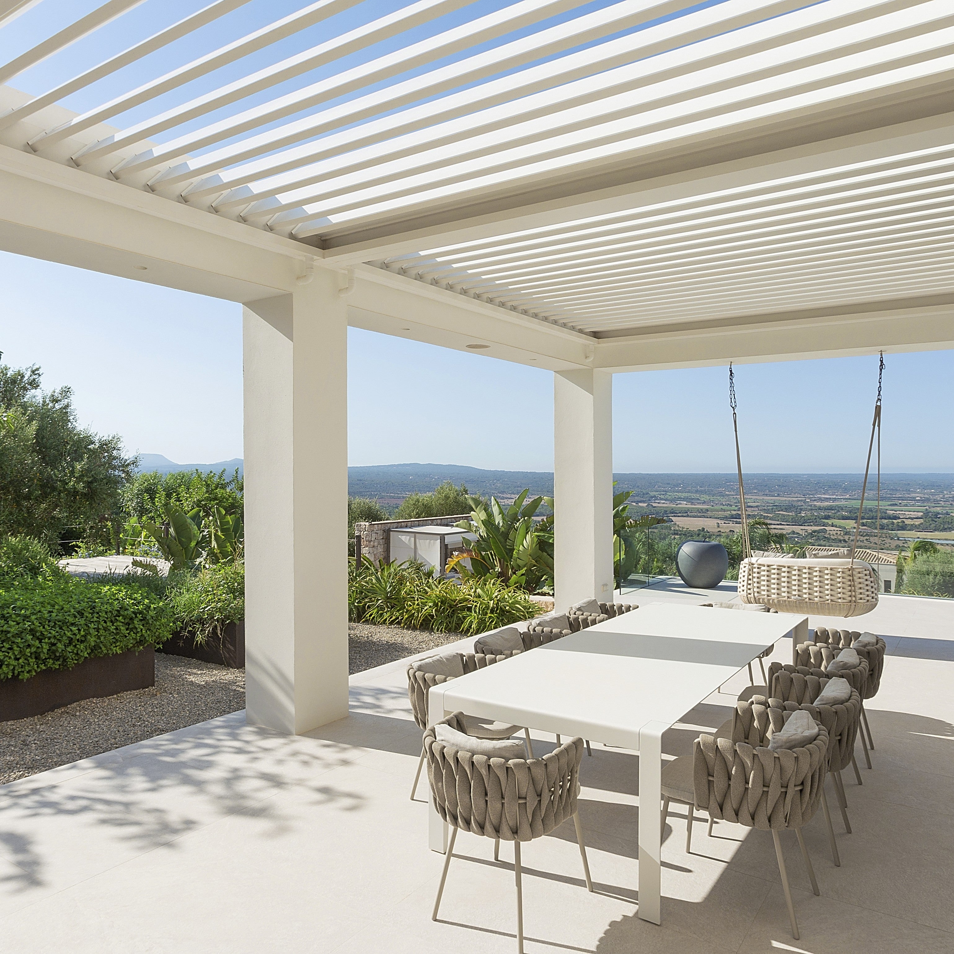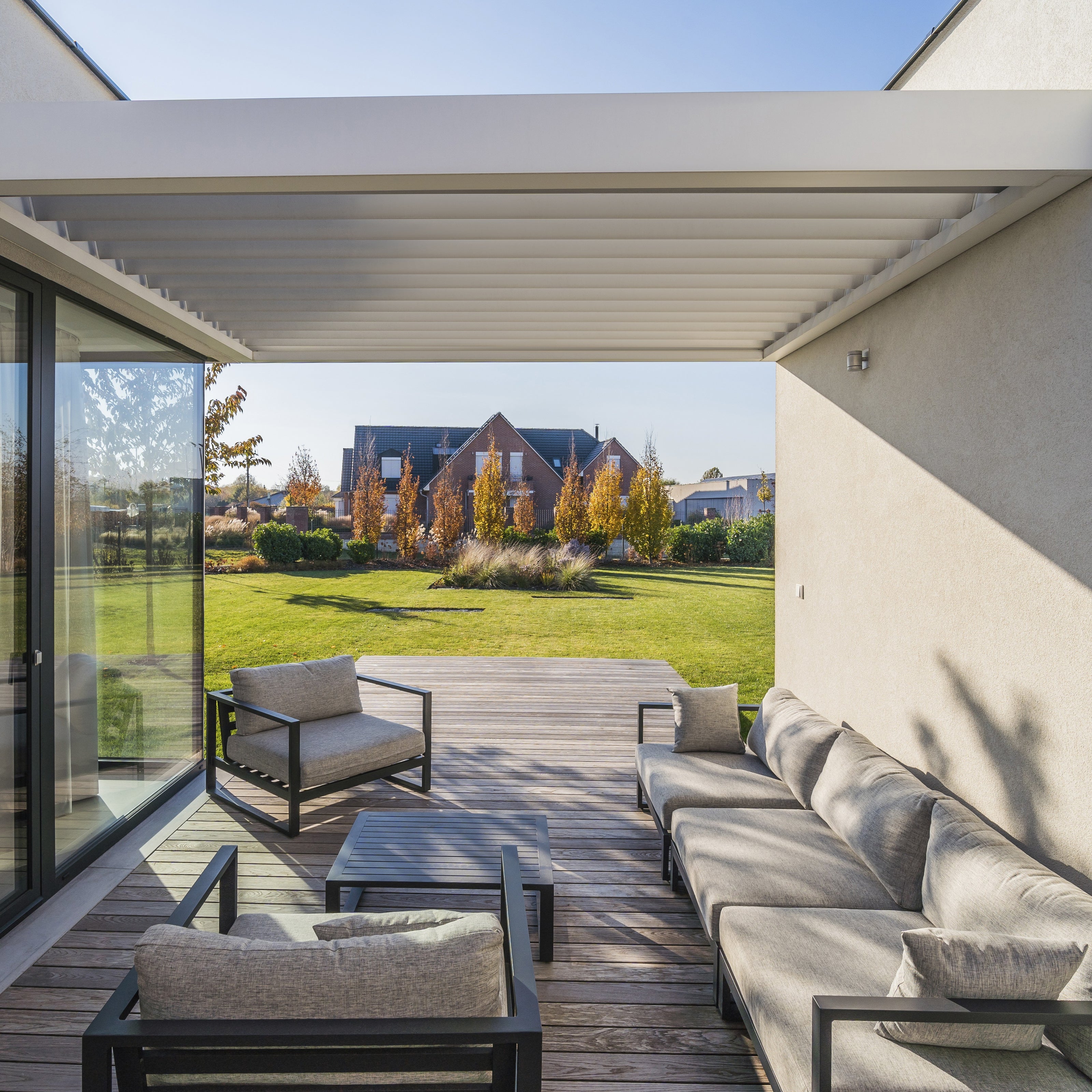 The Renson Aero is a sleek, built-in louvered roof system designed to integrate seamlessly into new or existing structures. Its rotating aluminium blades provide precise control over sunlight, shade, and ventilation, while the closed position offers full protection from the elements thanks to an integrated drainage system. Unlike freestanding pergolas, the Aero is made to be installed within a structural frame, making it ideal for custom architectural designs where discretion and minimalism are key. With a range of optional features like LED lighting and weather sensors, the Aero combines clean aesthetics with functional performance—delivering a tailored solution for stylish, weatherproof outdoor comfort.